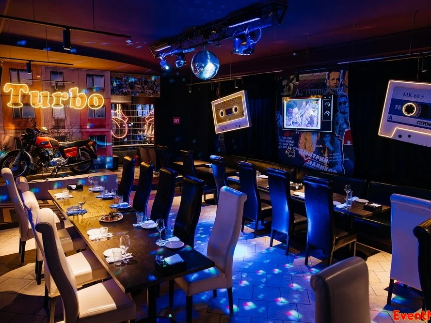 Мотоцикл в главном зале, диско-шары, боди-стенды Сергея Жукова, ковры на стенах, приставки и игрушки из 1990-х, кассеты и плакаты — уникальные атрибуты того времени собраны в интерьере и гармонично вписались в него.