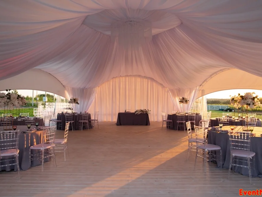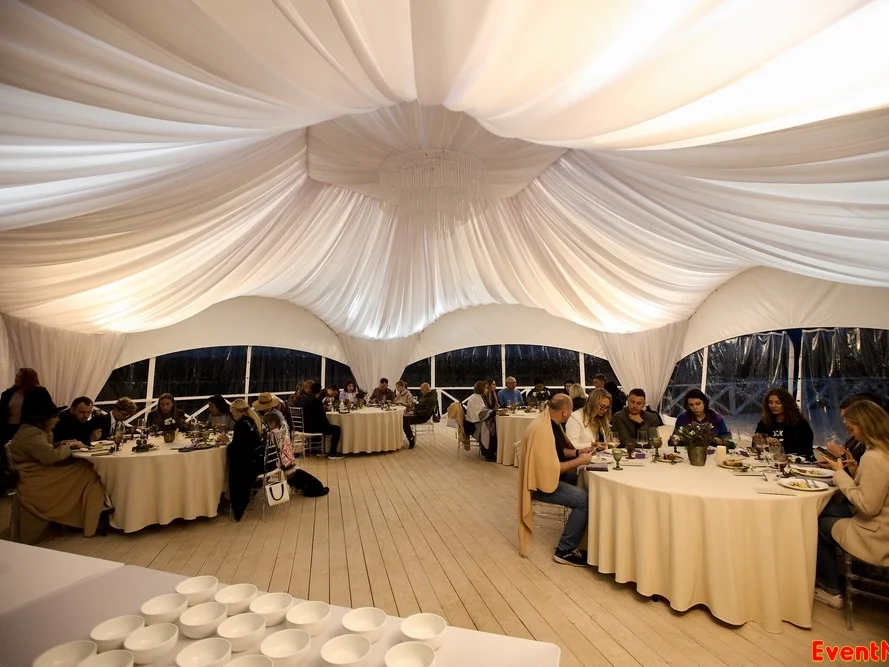 Для мероприятия любого формата: от бизнес-конференции до роскошной свадьбы. В шатре может разместиться до 100 гостей.
