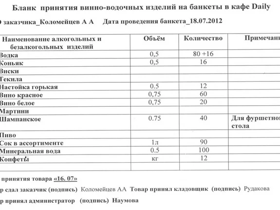 За 2-3 дня до начала банкета заказчики привозят в кафе винно-водочную продукцию. Кладовщик принимает, пересчитывает, вписывает количество в готовый «Бланк принятия винно-водочных изделий на банкет». Заполняет «Бланк» в 2-х экземплярах, один выдается заказчику, другой остается в кафе.