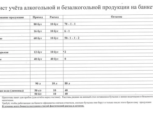 Для контроля и учета алкоголя во время банкета есть «Лист учета»: